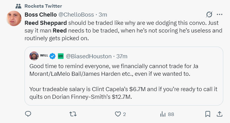 休媒:我提醒一下大家,从薪金的角度来看,我们没有可能交易得到莫兰特、三球、哈登这样的球员,我们可以交易的资产卡佩拉670万、芬尼史密斯1270万而已。