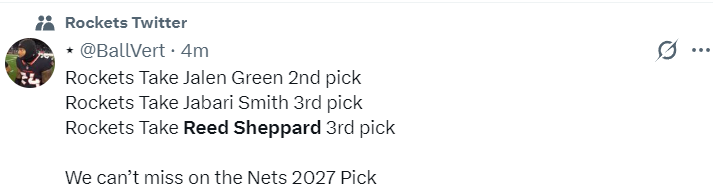 火蜜晒出火箭队此前榜眼签选杰伦-格林、探花签选小贾巴里-史密斯、探花签选谢泼德,我们在2027年篮网那个选秀权不能再出错了。